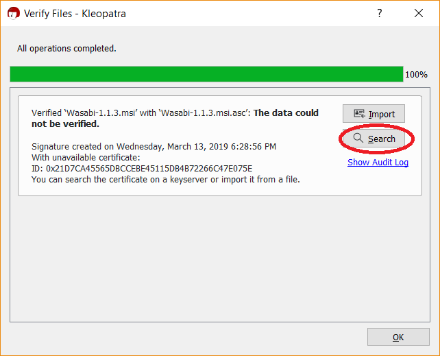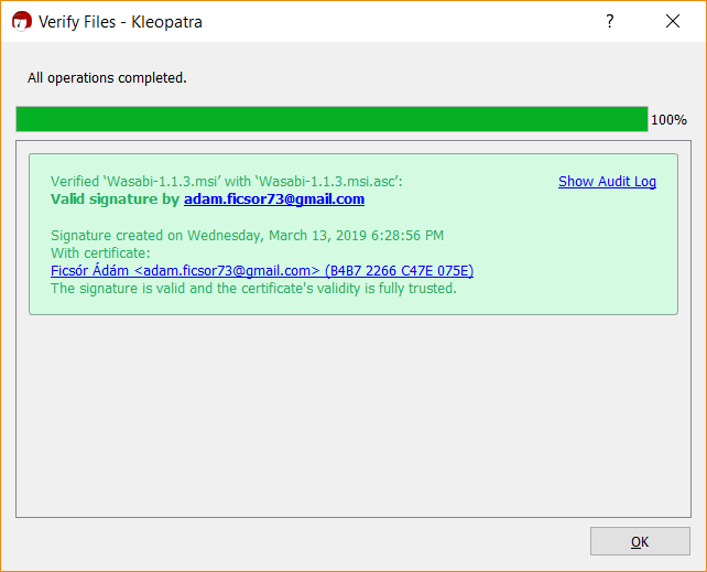With this public key, from now on, you will be able to make sure the Wasabi software you download was not tampered by checking against the corresponding .asc file: