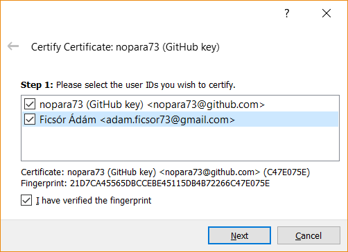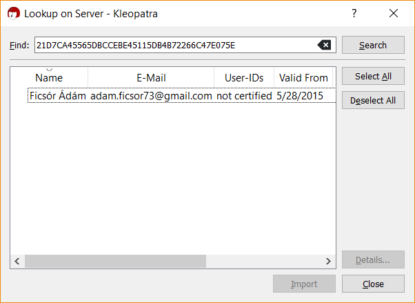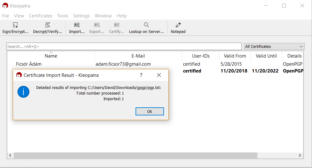 Kleopatra pops up and Ficsór Ádám's key imported. Press OK and Close Kleopatra