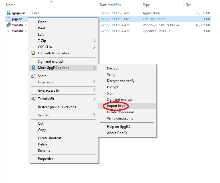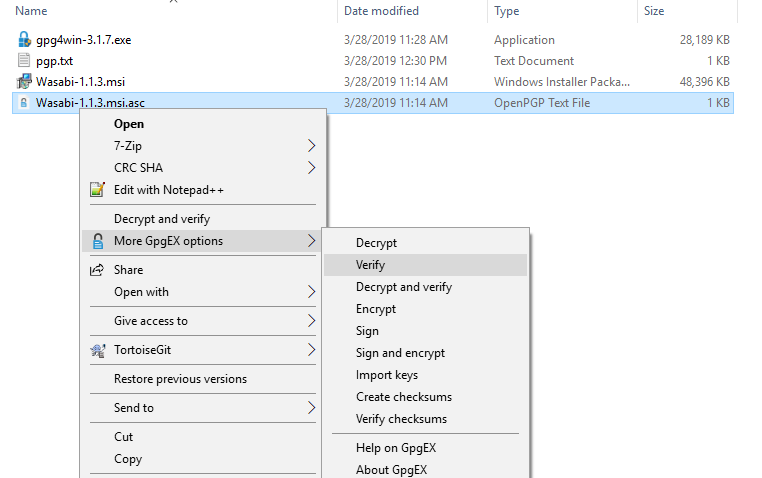 Example: gpg --verify WasabiInstaller.msi.asc WasabiInstaller.msi.