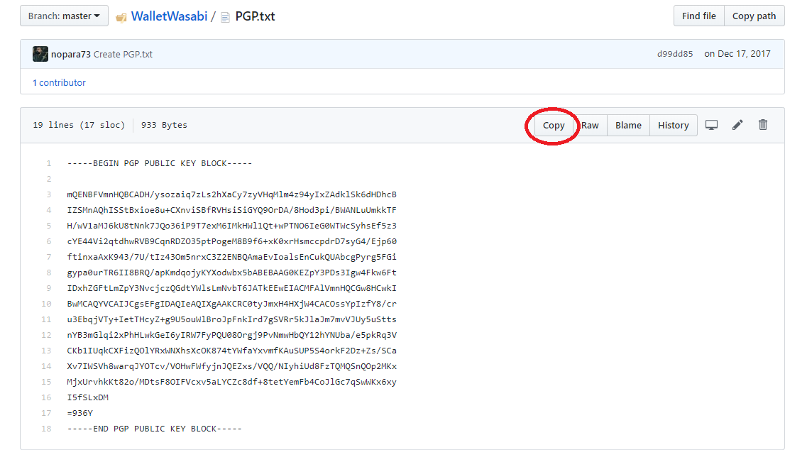 Open this site, you will find the developer(nopara73) public key there nopara73's PGP. Press Copy