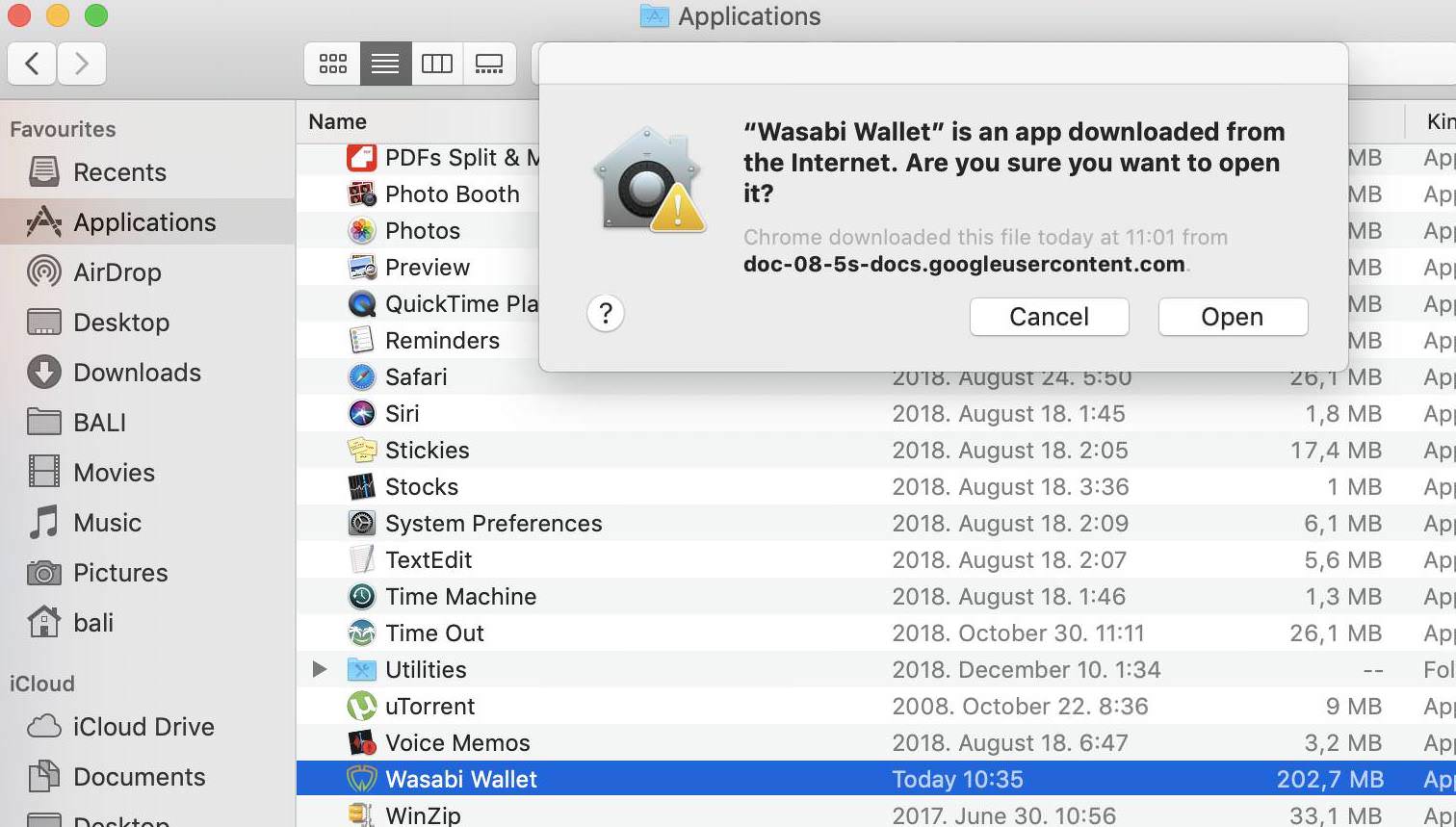After opening Wasabi, you may encounter a security popup. You can bypass it in multiple ways. One way would be to keep the control key down while opening Wasabi.